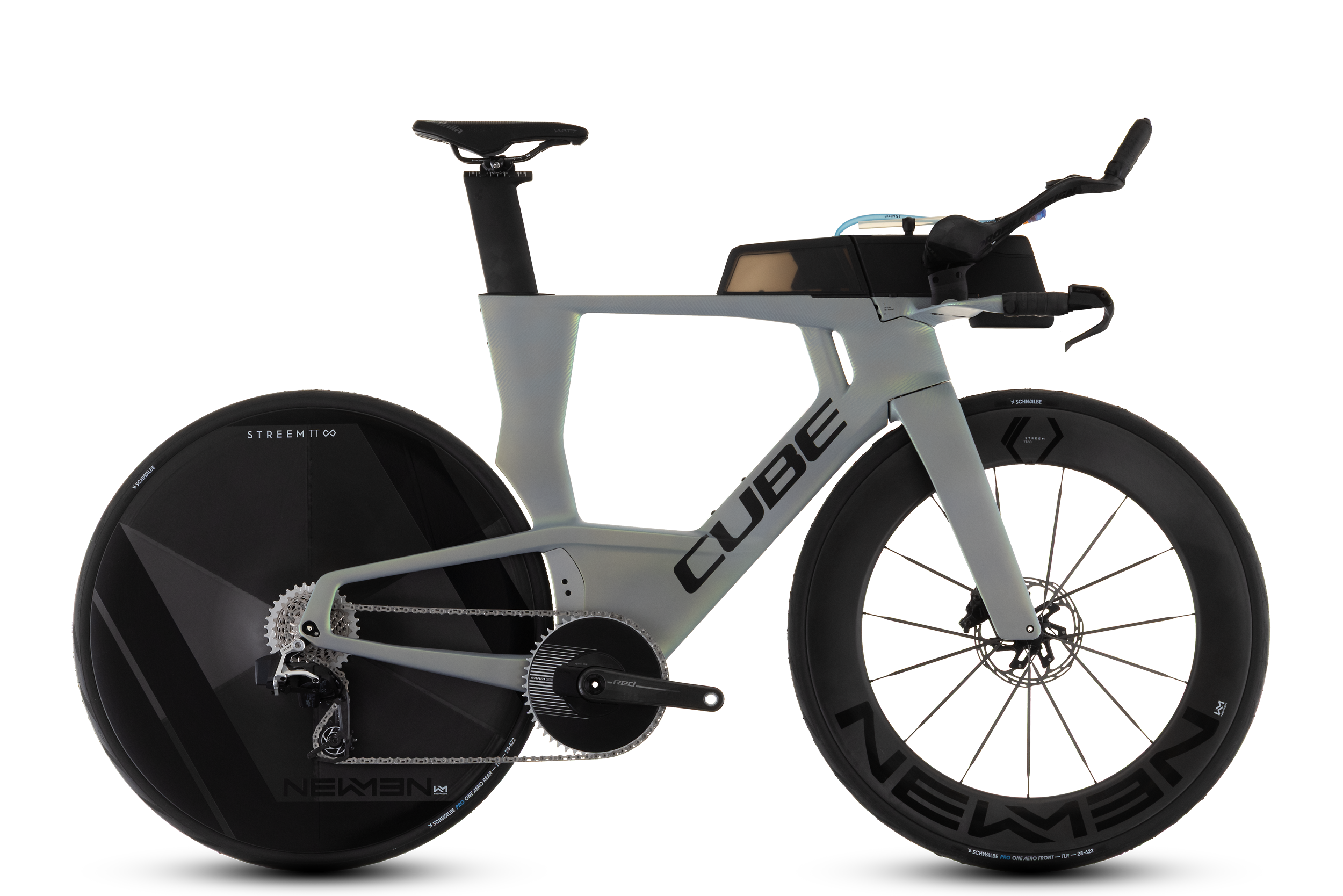 Der härteste Gegner im Kampf um Sekunden? Genau, der Luftwiderstand! Deshalb haben wir unser siegreiches Triathlon-Bike noch mal unter die Lupe genommen und mit noch aerodynamischeren Komponenten bestückt. Das Ergebnis ist das Aerium C:68X SLT Aero, das durch die Luft schneidet wie ein heißes Messer durch Butter! Profile Design ASC Pro Extensions und unser CUBE Cockpit ermöglichen eine individuelle, aber extrem windschnittige und damit supereffiziente Sitzposition. Der Newmen Streem TT80/Disc Vonoa Laufradsatz kommt mit einer Carbonscheibe hinten, die perfekt mit dem Hochprofil-Vorderrad harmoniert. Durch die Kombination mit den aerodynamischen Pro One Aero Pneus von Schwalbe wird jedes Watt effizient in Vortrieb umgewandelt. Diese Power übersetzt die Sram Red AXS 1×12-fach Schaltung mit einer gewachsten Ceramicspeed Red Kette samt passender Red Kurbel mit eingebautem Powermeter. Ebenso aerodynamisch wie kraftvoll: die Sram S-900 Aero Bremsen. Dieses Bike bedeutet Speed pur – damit ist der beste Bikesplit so gut wie gesetzt!